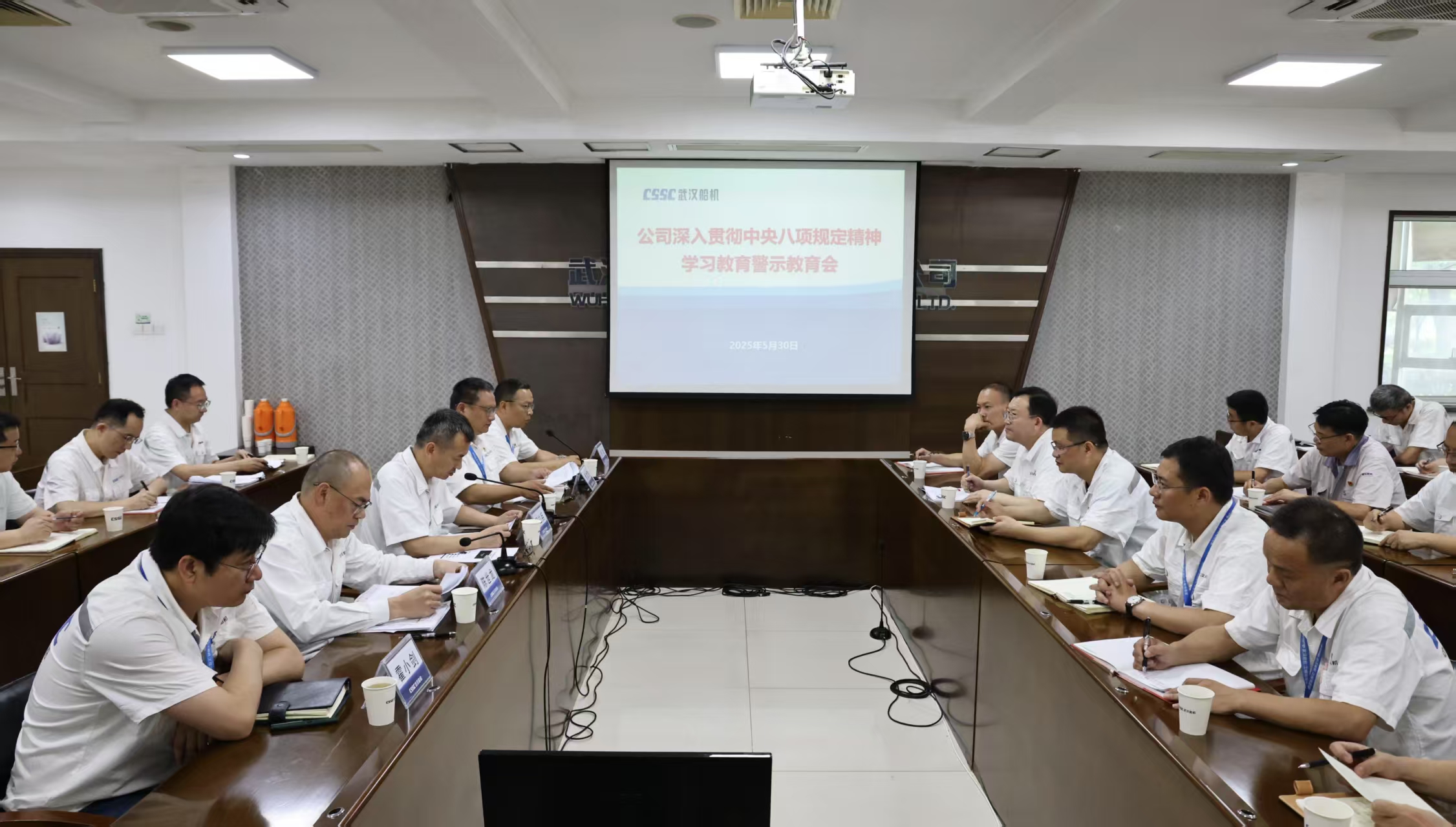 5月30日,中船集團武漢船機黨委召開深入貫徹中央八項規定精神學習教育警示教育會。公司黨委副書記、總經理程立兵主持會議。公司黨委委員、副總經理潘文勝傳達了習近平總書記關于加強黨的作風建設的重要論述和重要指示批示精神。公司黨委委員、總會計師陳世龍通報了中央層面深入貫徹中央八項規定精神學習教育工作專班、中央紀委辦公廳公開通報李獻林、葉金廣等人違規吃喝嚴重違反中央八項規定精神問題,以及公司違反中央八項規定精神典型案例。會議集中觀看了警示教育片。